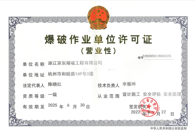 近日,京安公司通过层层审核,顺利完成营业性爆破作业单位许可证一级资质的延续工作,为企业后续发展奠定了坚实的基础。