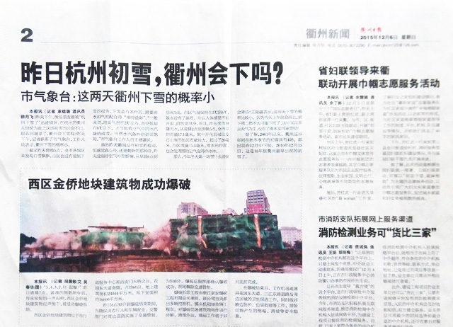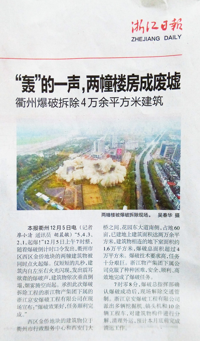 “5、4、3、2、1,起爆!”12月5日上午7时整,随着爆破倒计时口令发出,衢州市区西区金侨地块的两幢建筑物被同时点火起爆。仅短短的几秒,建筑内自南至北火光闪现,发出一阵阵连续清脆的爆破声,建筑物依次垂直倒塌,烟雾腾空而起。承担此次爆破拆除工程的浙江物产集团下属的ky网页版在现场宣布:“爆破效果良好,任务顺利完成!”