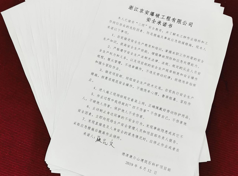 四、开展“安全生产承诺书”活动。“自觉履行岗位安全职责,严格遵守安全操作规程,做到不违章作业,不冒险蛮干,不违反劳动纪律……”,全体施工人员在认真学习安全生产承诺内容的基础上,严肃认真签上了自己的名字,庄严承诺安全生产,共签订承诺书21份;通过本次承诺书的签订,使全体施工人员感受到“签下的是承诺,扛起的是责任”,都再次明确了自己在安全生产上的职责和义务,要共同承担起施工安全生产的重任。